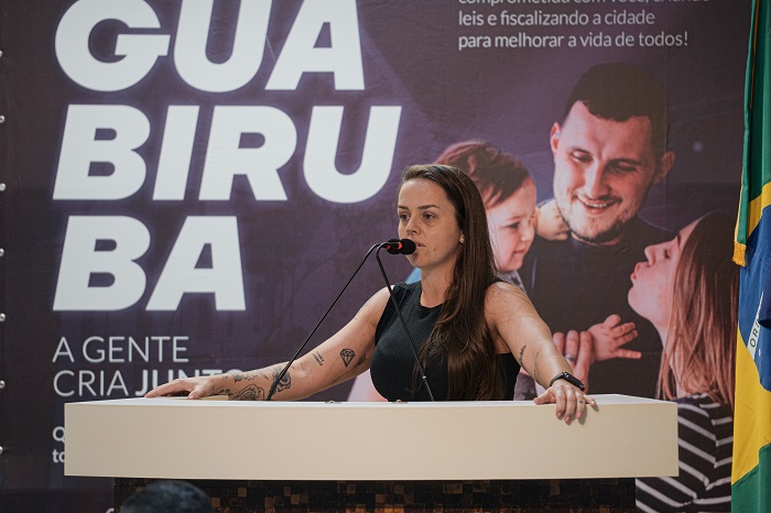 A vereadora iniciou sua fala saudando os colegas vereadores e o público presente, destacando especialmente Aloncio, Amandinha, Dona Maria, Wilke e Marquinhos. Ela parabenizou Marquinhos por suas conquistas na corrida, mencionando que ele consegue correr 100 quilômetros com apenas 40 segundos de descanso em cada ponto, enquanto ela só conseguiu fazer 21 quilômetros. Ela agradeceu a Marquinhos por representar Guabiruba em diversos lugares.